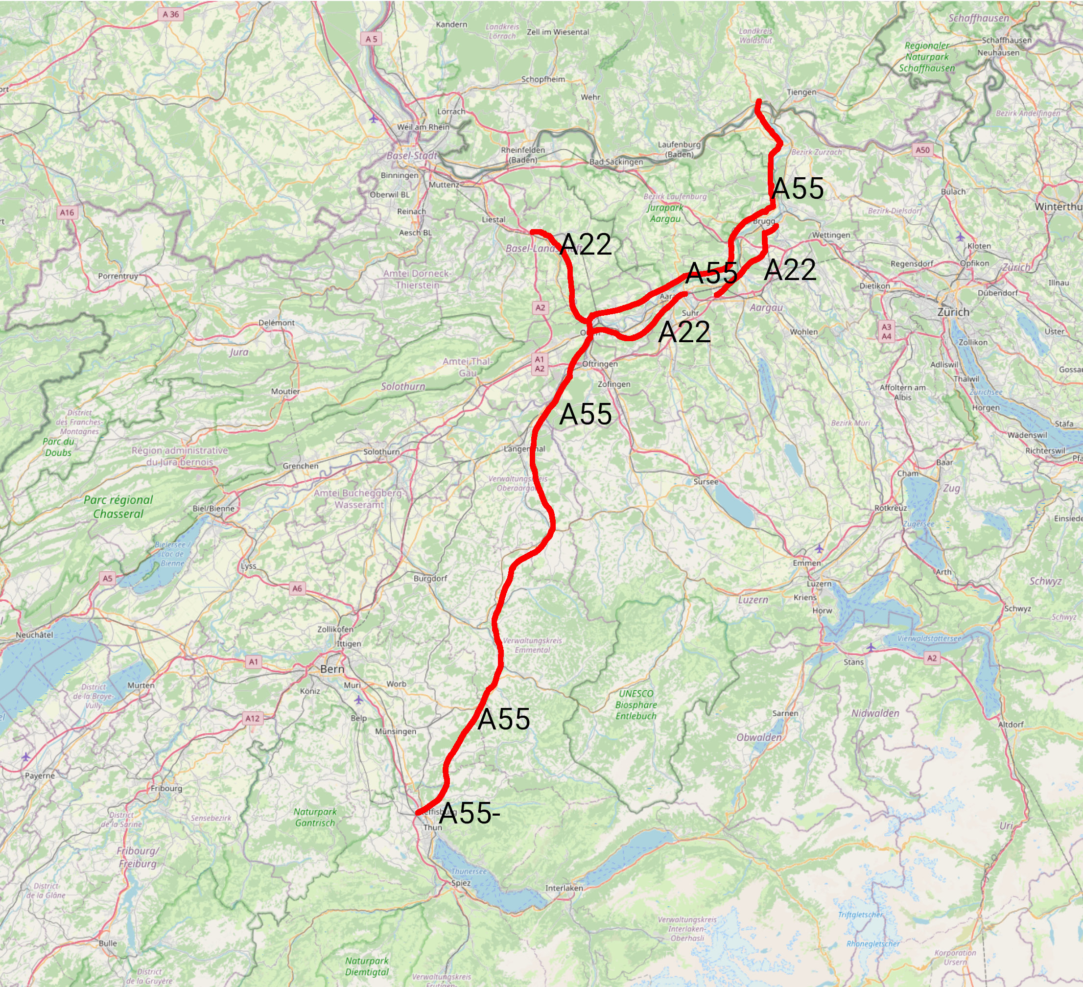 Perspektivisch kann die A55 durch das Simmental zum Südufer des Genfer Sees und dann durch Frankreich bis zum Rhonetal verlängert werden und von Waldshut nach Norden durch den Schwarzwald nach Pforzheim.